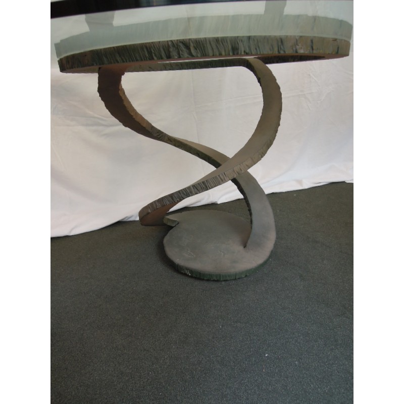 Round base made of a single slab of cast steel, cut and stretched, supporting a thick glass top.