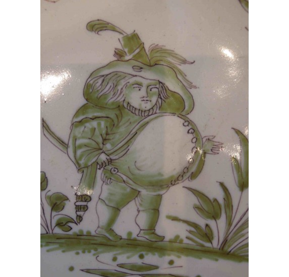 Decor grotesque character (paunchy) surrounded by flowers and stylized foliage, green edging trim.