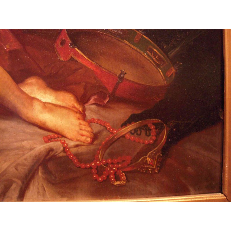 Fine oil on mahogany panel, depicting a young woman and a goat, sitting on a bed covered with shimmering fabrics, jewelry and a tambourine.