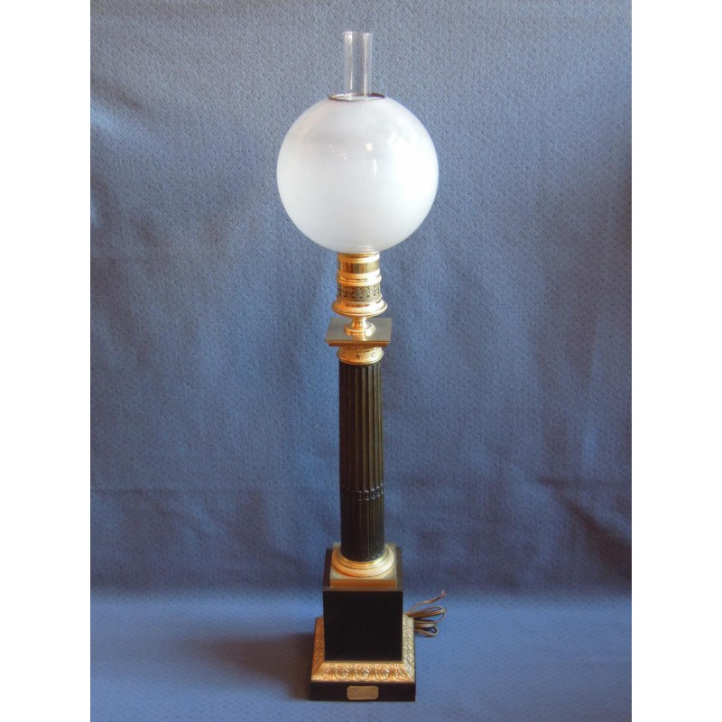 Grande lampe Carcel en tôle et bronze doré. La base est à décor de palmettes avec le cartouche en bronze de Carcel, rue de l'arbre sec à Paris.