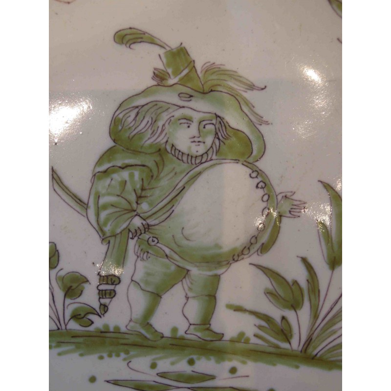 Décor de personnage grotesque (bedonnant) entouré de fleurs et feuillages stylisés, liseret vert en bordure.