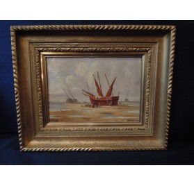 Cette huile sur panneau représente un vacher, son chien et leurs vaches dans un pré au bord de l'eau. Très belle lumière.